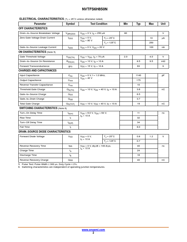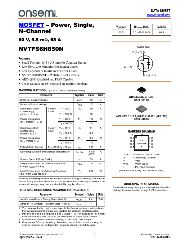 MOSFET Power, Single, N-Channel 80 V, 9.5 mW, 68 A NVTFS6H850N.