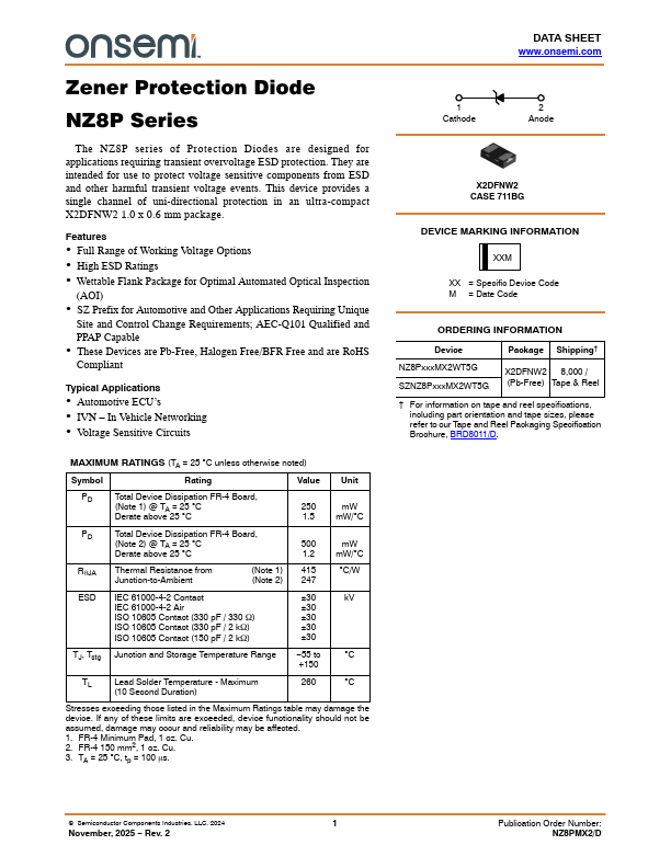 Zener Protection Diode NZ8P Series The NZ8P series of Protection Diodes are designed for applications requiring transient overvoltage ESD protection. They are intended for use to protect voltage sensitive ponents from ESD and other harmful transient voltage events. This device provides a single channel of uni-directional protection in an ultra-pact X2DFNW2 1.0 x 0.6 mm package.