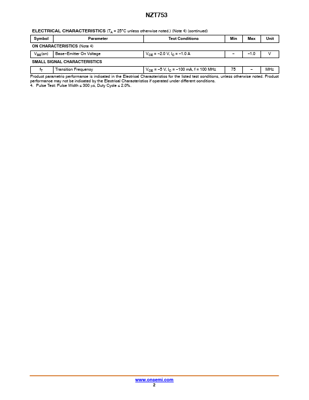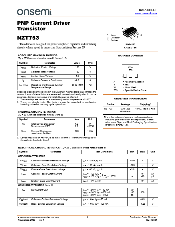 Overview: DATA SHEET www.onsemi.com PNP Current Driver Transistor NZT753 This device is designed for power amplifier, regulator and switching circuits where speed is important. Sourced from Process 5P. 4 1.