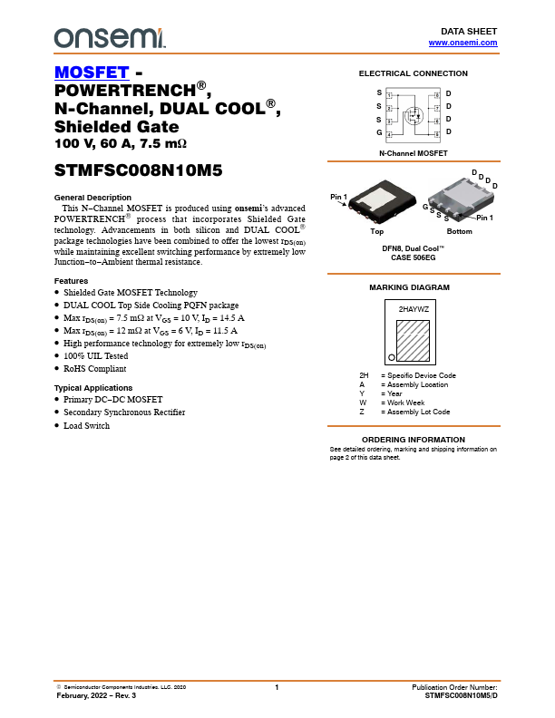 This N-Channel MOSFET is produced using onsemi’s advanced POWERTRENCH® process that incorporates Shielded Gate technology. Advancements in both silicon and DUAL COOL® package technologies have been combined to offer the lowest rDS(on) while maintaining excellent switching performance by extremely low Junction-to-Ambient.
