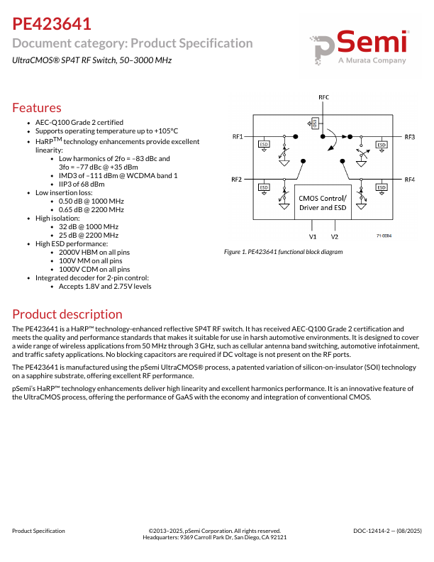 The PE423641 is a HaRP™ technology-enhanced reflective SP4T RF switch.