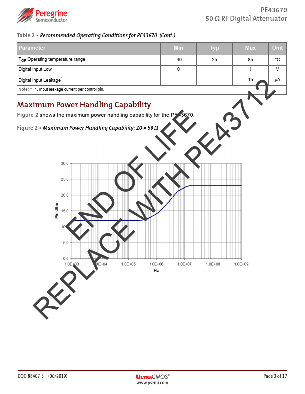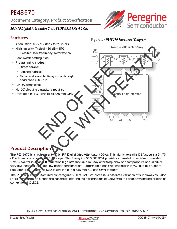 The PE43670 is a high linearity, 7-bit RF Digital Step Attenuator (DSA). This highly versatile DSA covers a 31.75 A dB attenuation range in 0.25 dB steps. The Peregrine 50Ω RF DSA provides a parallel or serial-addressable L CMOS control interface.