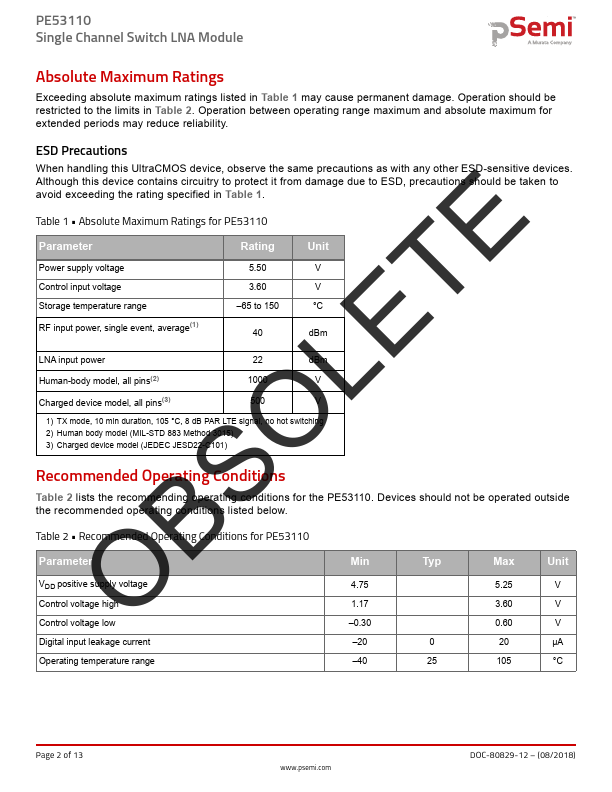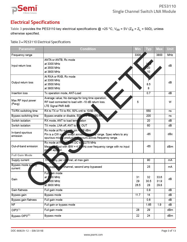 The PE53110 is a highly integrated front-end module targeted for wireless infrastructure applications such as S TDD macro/micro base stations and MIMO applications. It is designed for use at the front end of a receiver chain for a TDD-based system. The PE53110 is ideally suited for 4G or next-generation 5G solutions, or small cell applications.