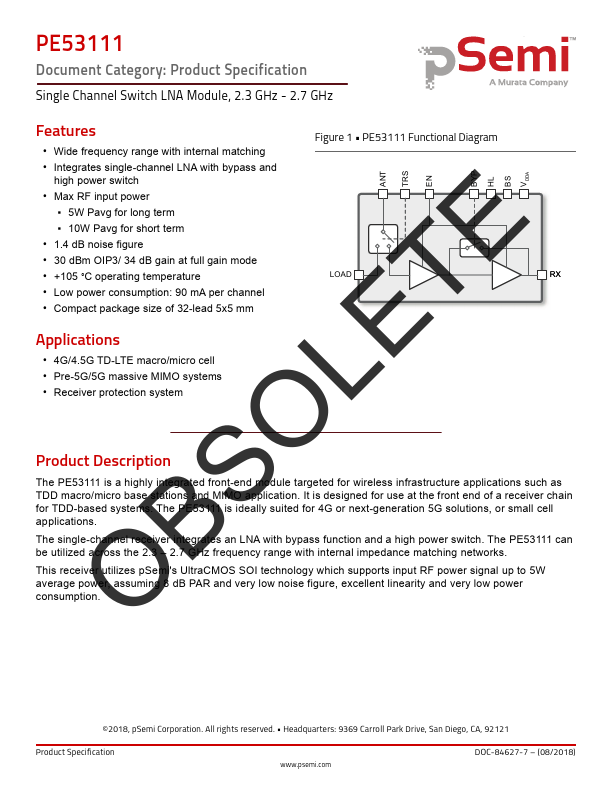 The PE53111 is a highly integrated front-end module targeted for wireless infrastructure applications such as S TDD macro/micro base stations and MIMO application. It is designed for use at the front end of a receiver chain for TDD-based systems. The PE53111 is ideally suited for 4G or next-generation 5G solutions, or small cell applications.