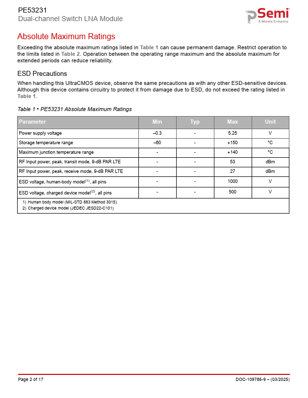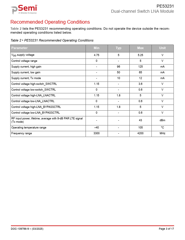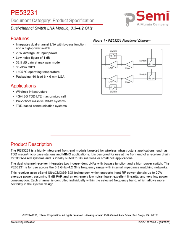 The PE53231 is a highly integrated front-end module targeted for wireless infrastructure applications, such as TDD macro/micro base stations and MIMO applications. It is designed for use at the front end of a receiver chain for TDD-based systems and is ideally suited to 5G solutions or small cell applications. The dual-channel receiver integrates two independent LNAs with bypass function and a high-power switch.