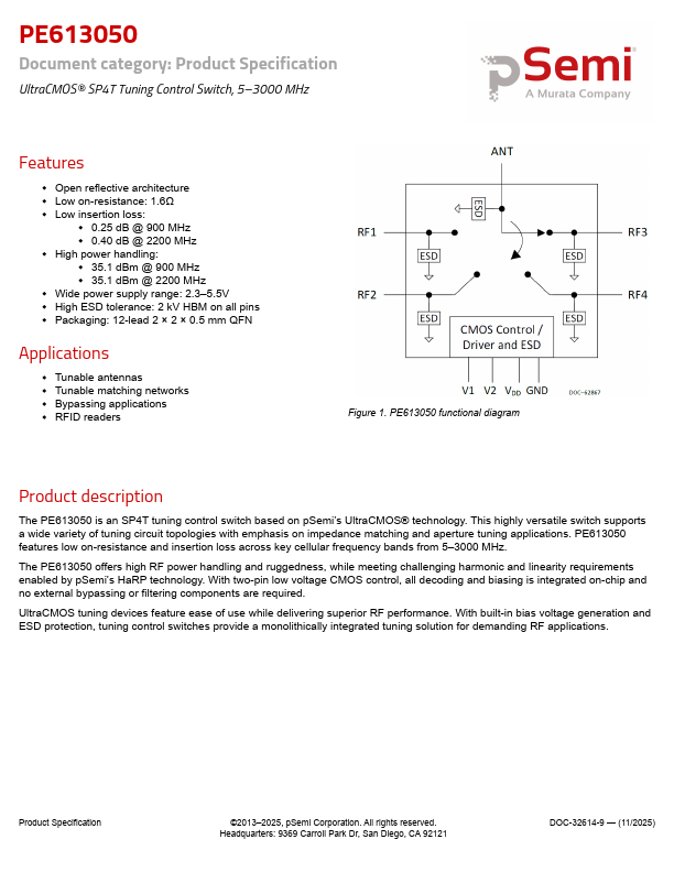 The PE613050 is an SP4T tuning control switch based on pSemi’s UltraCMOS® technology.