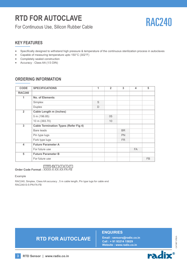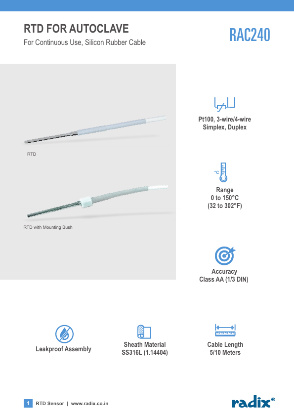It is capable of measuring temperature upto 150°C (302°F). RAC240 has a pletely sealed construction. As a result, the entire sensor assembly, including the probe and cables extending from the RTD, can be pletely submerged in water without affecting accuracy or long-term stability.