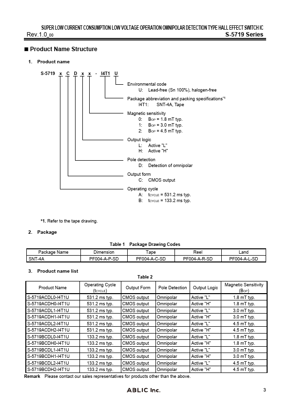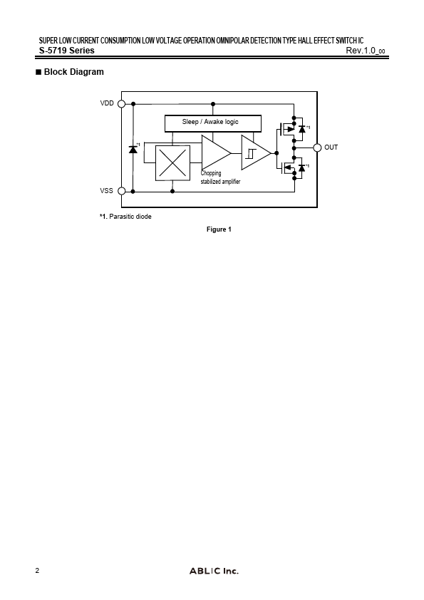 Power supply pin GND pin No connection Output pin 1. Absolute Maximum Ratings Table 4 (Ta = +25°C unless otherwise specified) Item Symbol Applicable Pin Absolute Maximum Rating Unit Power supply voltage VDD - VSS - 0.3 to VSS + 7.0 V Output current IOUT OUT ±1.0 mA Output voltage VOUT OUT VSS - 0.3 to VDD + 0.3 V Operation ambient temperature Topr - -40 to +85 °C Stor