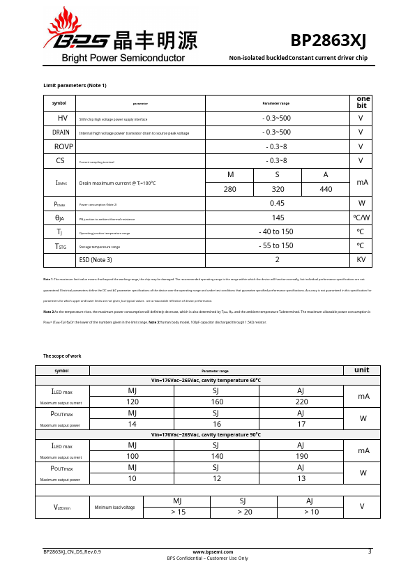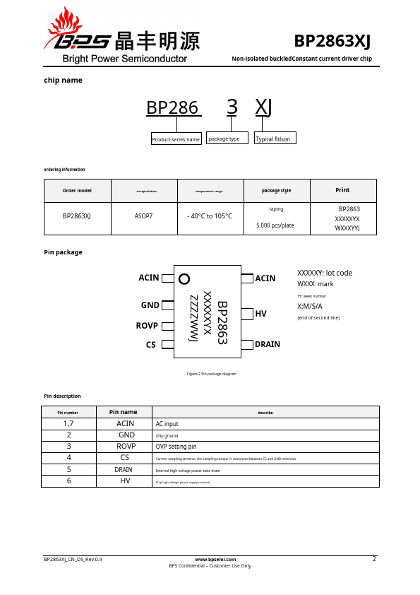 Pin number 1,7 2 3 4 5 6 Figure 2 Pin package diagram Pin name ACIN GND ROVP CS DRAIN HV AC input chip ground OVP setting pin describe Current sampling terminal, the sampling resistor is connected between CS and GND terminals Internal high voltage power tube drain Chip high voltage power supply terminal BP2863XJ_CN_DS_Rev.0.9 www.bpsemi.com 2 BPS Confidential Customer Use Only BP2863XJ Non-isolated buckledConstant current driver chip Limit parameters (Note 1) symbol param