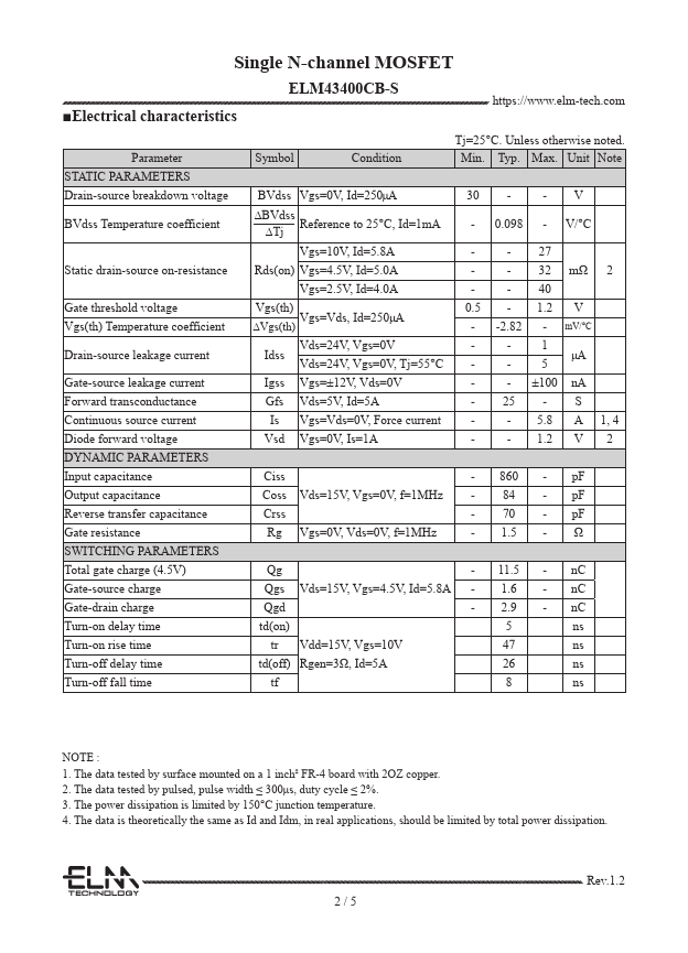 ELM43400CB-S uses advanced trench technology to provide excellent Rds(on), low gate charge and low gate threshold voltage.