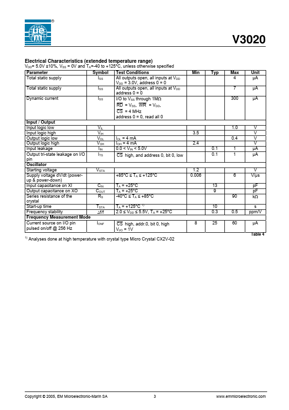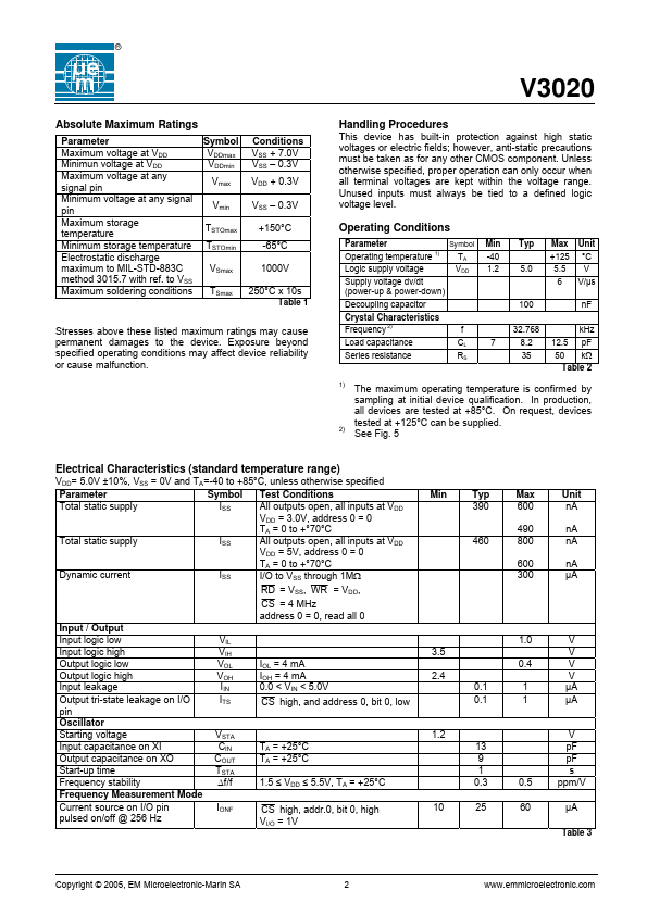 R EM MICROELECTRONIC - MARIN SA V3020 Ultra Low Power 1-Bit 32 kHz RTC .V3020 Features