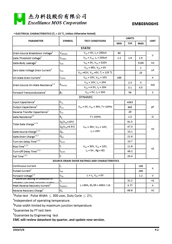 N-CH BVDSS 60V RDSON (MAX.)@VGS=10V RDSON (MAX.)@VGS=4.5V ID @TC=25℃ 3.0mΩ 4.5mΩ 166A ID @TA=25℃ 22A Single N Channel MOSFET UIS, Rg 100% Tested RoHS & Halogen Free & TSCA Compliant ABSOLUTE MAXIMUM RATINGS (TC = 25 °C Unless Otherwise Noted) PARAMETERS/TEST CONDITIONS SYMBOL Gate-Source Voltage VGS Continuous Drain Current TC = 25 °C TC = 100 °C ID Continuous Drain Current TA = 25 °C TA = 70 °C ID Pulsed Drain Current1 IDM Avalanche Current IAS Avalanche Energy L
