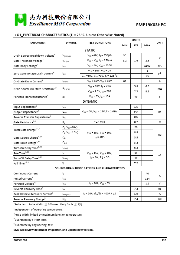 Q1 Q2 BVDSS RDSON (MAX.)@VGS=10V RDSON (MAX.)@VGS=4.5V 30V 6.6mΩ 8.8mΩ 30V 2.4mΩ 3.4mΩ ID @TC=25℃ 62A 171A ID @TA=25℃ 20A 38A Dual N Channel MOSFET UIS, Rg 100% Tested RoHS & Halogen Free & TSCA Compliant ABSOLUTE MAXIMUM RATINGS (TC = 25 °C Unless Otherwise Noted) PARAMETERS/TEST CONDITIONS SYMBOL LIMITS Q1 Q2 Gate-Source Voltage Continuous Drain Current Continuous Drain Current Pulsed Drain Current1 Avalanche Current Avalanche Energy Repetitive Avalanche Energy2 TC =