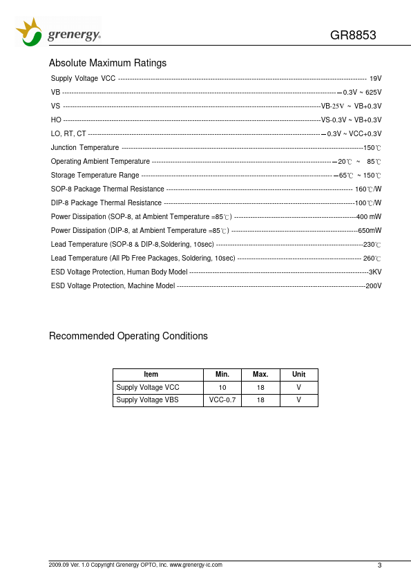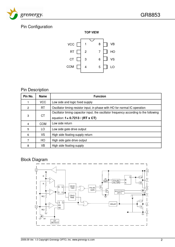 GR8853 is a high voltage, high speed, self-oscillating power MOSFET and IGBT driver with both high and low side referenced output channels.