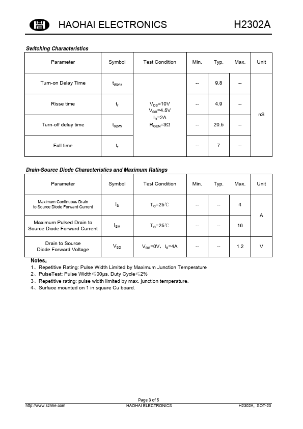 HAOHAI ELECTRONICS H2302A 4A, 20V, N-Channel MOSFET .