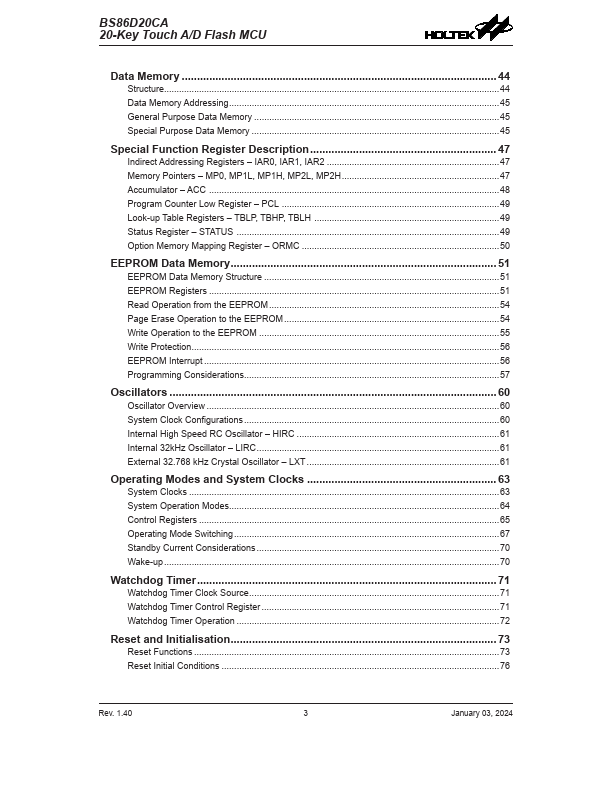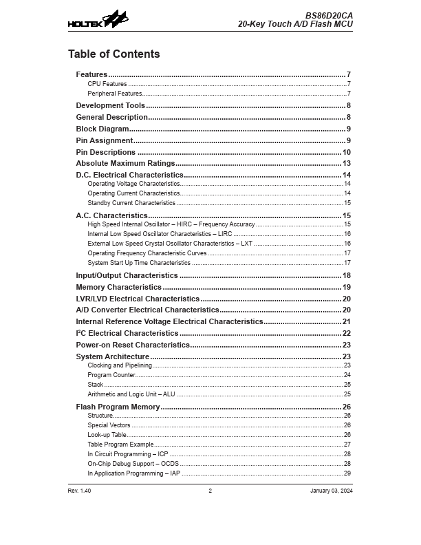 20-Key Touch A/D Flash MCU BS86D20CA Revision: V1.40 Date: January 03, 2024 BS86D20CA 20-Key Touch A/D Flash MCU Table of Contents .