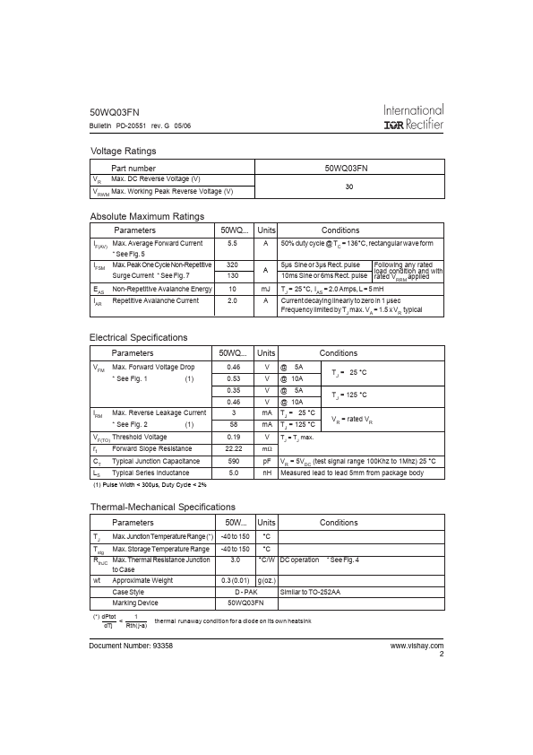 Bulletin PD-20551 rev.G 05/06 SCHOTTKY RECTIFIER 50WQ03FN 5.5 Amp IF(AV) = 5.5Amp VR = 30V Major Ratings and Characteristics Characteristics IF(A.50WQ03FN Applications