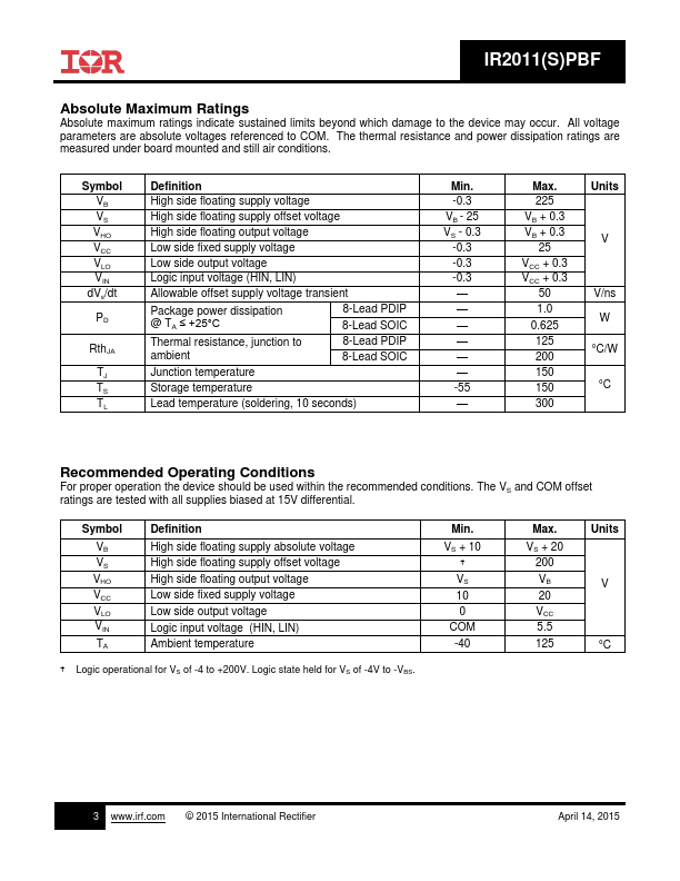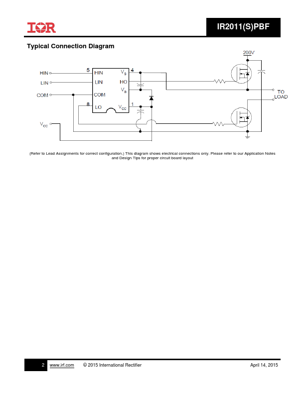 The IR2011 is a high power, high speed power MOSFET driver with independent high and low side referenced output Package Options channels.Logic inputs are compatible with standard CMOS or LSTTL output, down to 3.0V logic.The output drivers feature a high pulse current buffer stage designed for minimum driver cross-conduction.Propagation delays are matched to simplify use in high frequency applications.The floating channel can be used to drive an N-channel power MOSFET in the high sid