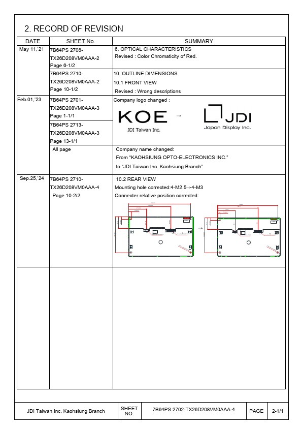 FOR MESSRS : DATE : Sep.25th ,2024 CUSTOMER’S ACCEPTANCE SPECIFICATIONS TX26D208VM0AAA Contents No.ITEM 1 COVER 2 RECORD OF REVISION 3 GENE.TX26D208VM0AAA Features