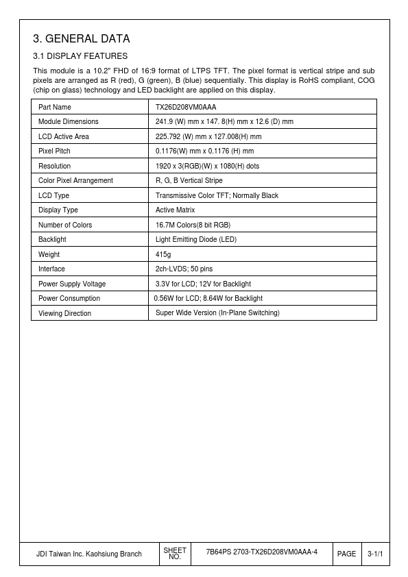 * This module is a 10.2” FHD of 16:9 format of LTPS TFT. The pixel format is vertical stripe and sub pixels are arranged as R (red), G (green), B (blue) sequentially. This display is RoHS compliant, COG (chip on glass) technology and LED backlight are applied on this display. Part Name Module Dimensi📁 Related Datasheet