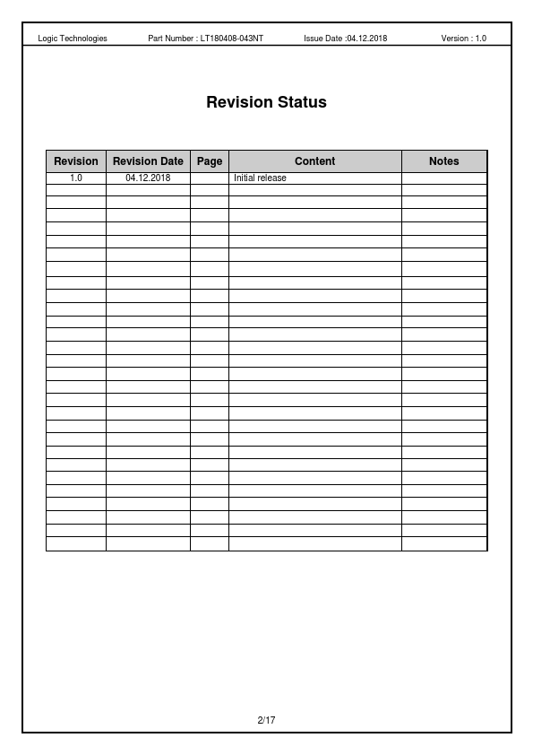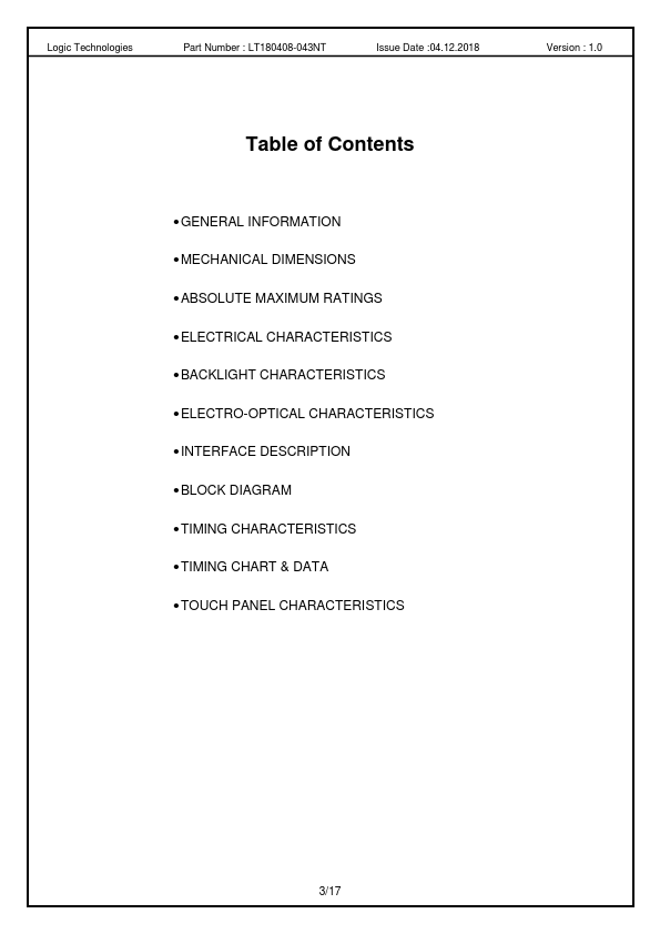 TFT Module 4.3” HVGA 480 x (RGB) x 272 Full viewing angle High brightness PART NUMBER LT180408-043NT VERSION 1.0 ROHS COMPLIANT 1/17 Logic Technologies Part Number : LT180408-043NT Issue Date :04.12.2018 Version : 1.0 Revision Status Revision Revision Date Page Content 1.0 04.12.2018 Initial release Notes 2/17 Logic Technologies Part Number : LT180408-043NT Issue Date :04.12.2018 Version : 1.0 Table of Contents GENERAL INFORMATION MECHANICAL DIMENSIONS