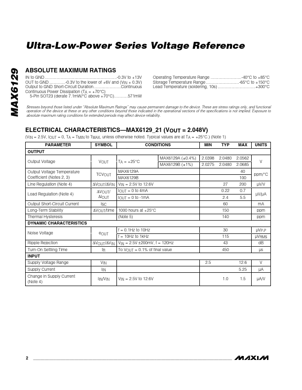 The MAX6129 micropower, low-dropout bandgap voltage reference combines ultra-low supply current and low drift in a miniature 5-pin SOT23 surface-mount package that uses 70% less board space than comparable devices in an SO package.