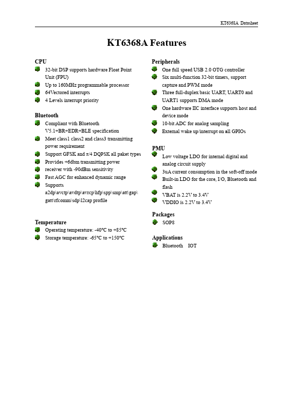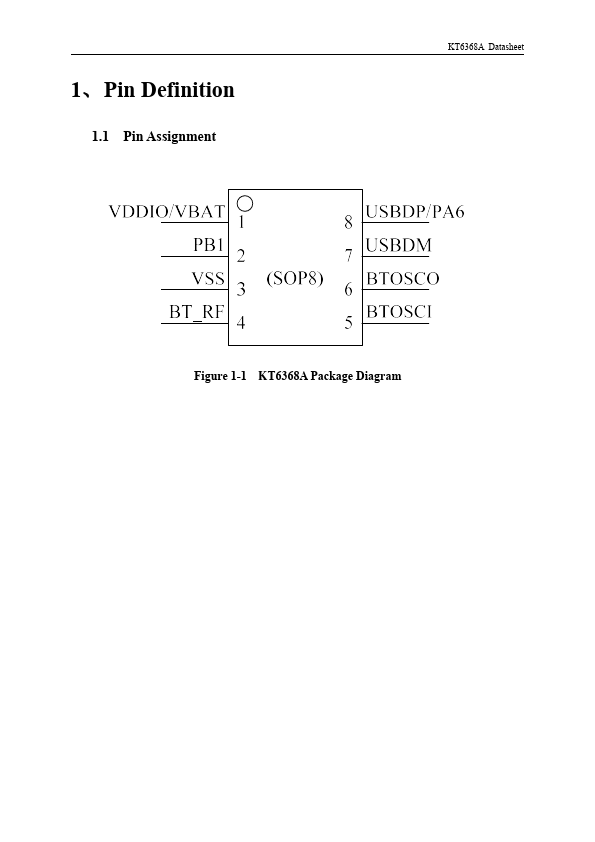Table 1-1 KT6368A Pin Description PIN Name NO.VBAT 1 VDDIO 2 PB1 3 VSS 4 BT_RF 5 BTOSCI 6 BTOSCO 7 USBDM USBDP 8 PA6 I/O Type P P I/O P / I O I/O I/O I/O Drive (mA) Function / / GPIO (pull up) / USB Negative Data (pull down) USB Positive Data (pull down) GPIO Other Function Battery Power Supply IO Power 3.3v Long Press Reset; ADC5:ADC Input Channel 5; UART0RXB:Uart0 Data In(B); Ground BT Antenna BT OSC In BT OSC Out IIC_SDA_A:IIC SDA(A); SPI2_DOB:SPI2 Data Out(B); ADC14:ADC Input Chan
