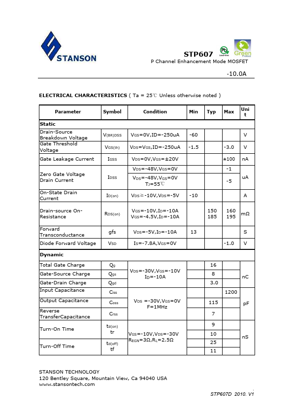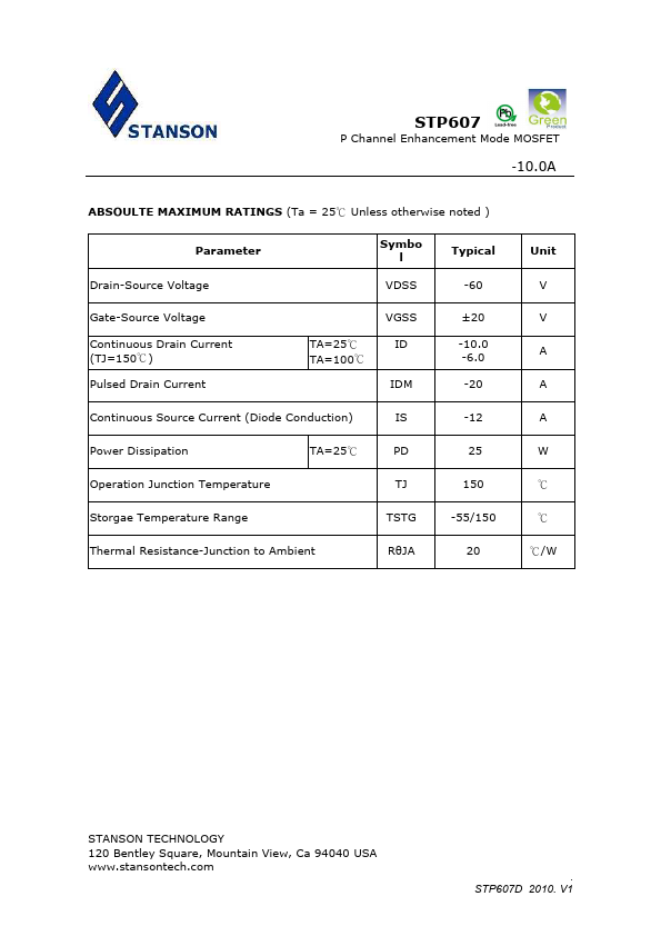 The STP607 by STANSON is a P-Channel Enhancement Mode MOSFET. Below is the official datasheet preview.