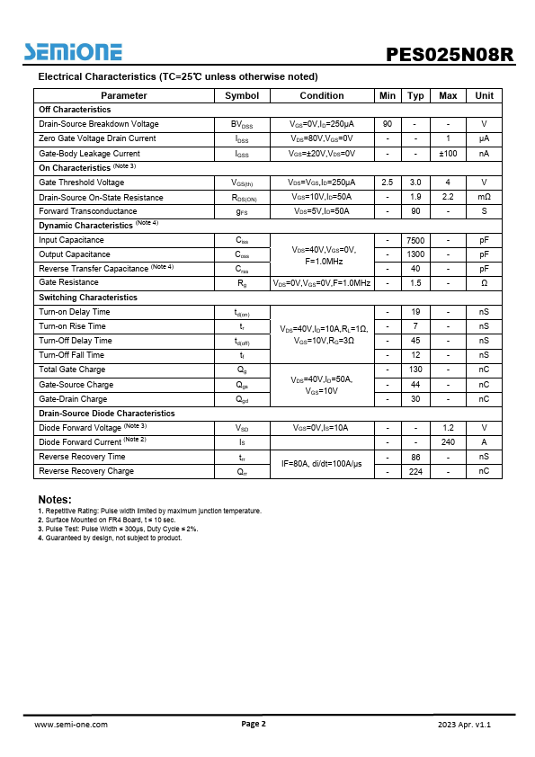 The PES025N08R by Semione is a N-Channel Enhancement Mode Power MOSFET. Below is the official datasheet preview.