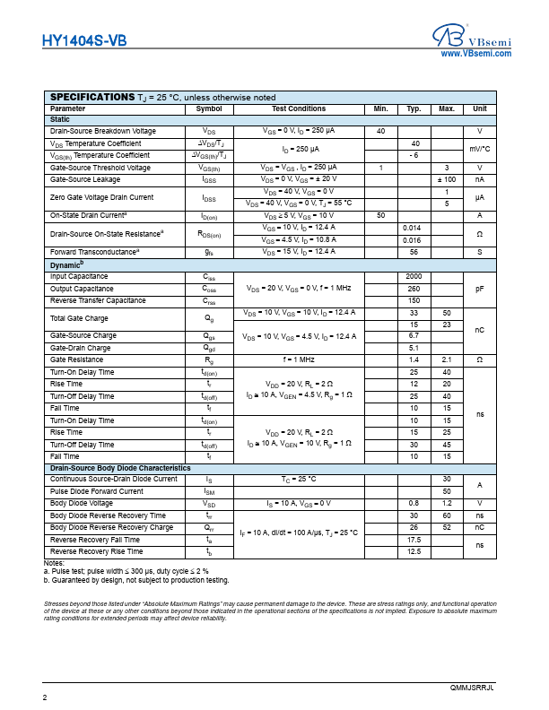 The HY1404S by VBsemi is a N-Channel 40V MOSFET. Below is the official datasheet preview.
