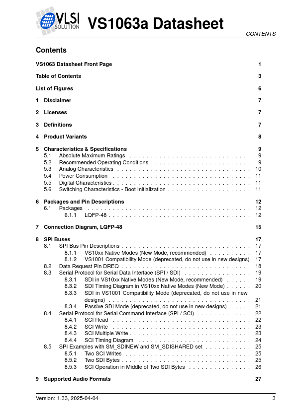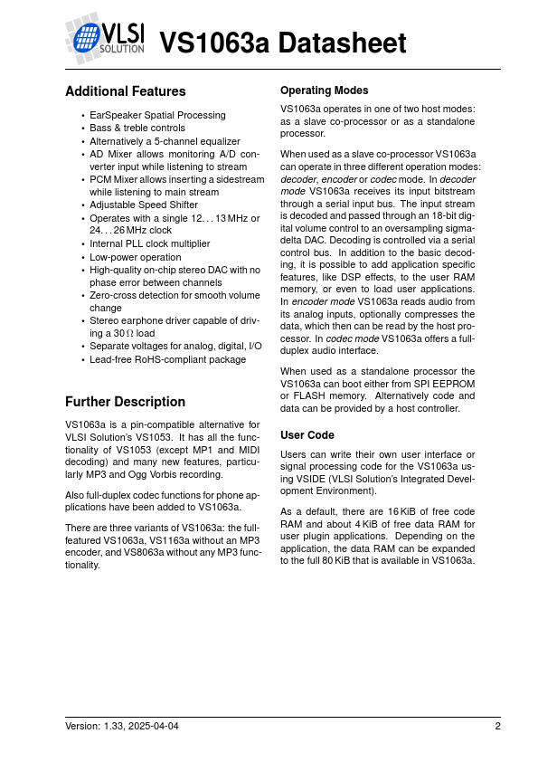 Encoders: VS1063a is an easy-to-use, versatile encoder, MP3; Ogg Vorbis; PCM; IMA ADPCM; decoder and codec for a multitude of audio G.711 (µ-law, A-law); G.722 ADPCM formats. Decoders: MP3 (MPEG 1 & 2 audio layer III (CBR +VBR +ABR)); MP2 (layer II) (optional); MPEG4 / 2 AAC-LC(+PNS), HE-AAC v2 (Level 3) (SBR + PS); Ogg Vorbis; FLAC; WMA 4.0/4.1/7/8/9 all profiles (5-384 kbps); WAV (PCM, IMA ADPCM, G.711 µ-law/Alaw, G.722 ADPCM) Full Duplex Codecs with optional
