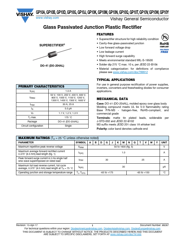 GP10A, GP10B, GP10D, GP10G, GP10J, GP10K, GP10M, GP10N, GP10Q, GP10T, GP10V, GP10W, GP10Y www.vishay.com Vishay General Semiconductor Glass Passiva.