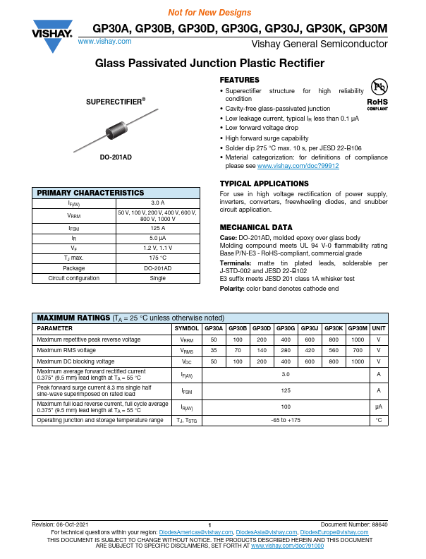 Not for New Designs GP30A, GP30B, GP30D, GP30G, GP30J, GP30K, GP30M www.vishay.com Vishay General Semiconductor Glass Passivated Junction Plastic .