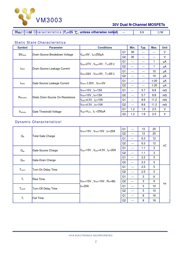 These N-Channel enhancement mode power field effect transistors are using trench DMOS technology.This Q1 advanced technology has been especially tailored to minimize on-state resistance, provide superior switching Q2 performance, and withstand high energy pulse in the avalanche and commutation mode.These devices are well suited for high efficiency fast switching applications.DFN3x3 Asymmetric Dual Pin Configuration S2 S2 G2S2 S2 S2 S2 G2 D1 D2 S1/D2 G1 G2 D1 D1 D1 G1D1 D