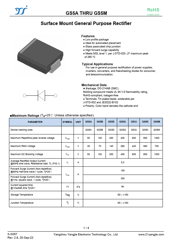 GS5A THRU GS5M Surface Mount General Purpose Rectifier RoHS COMPLIANT .