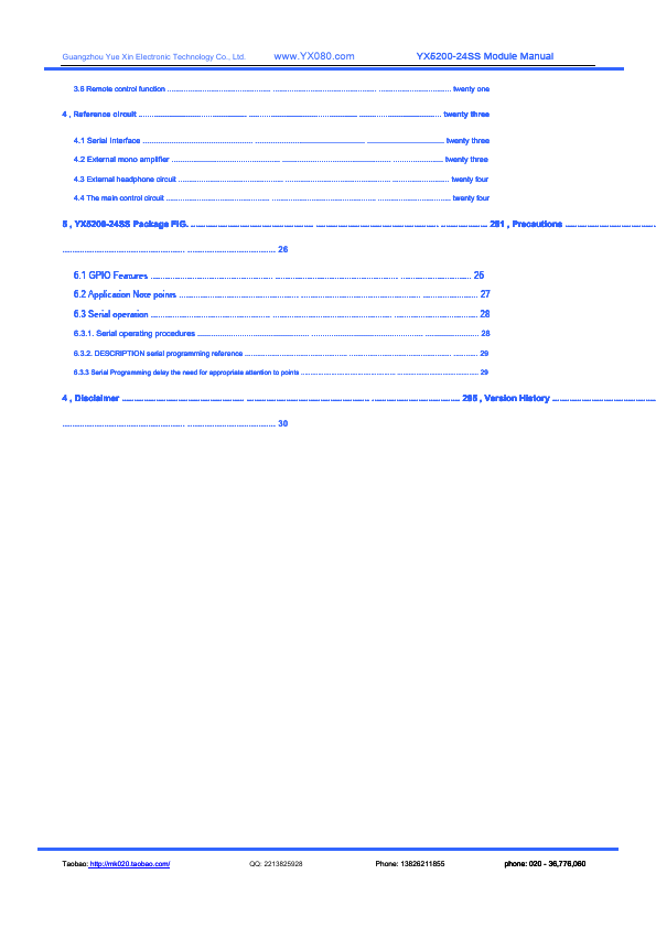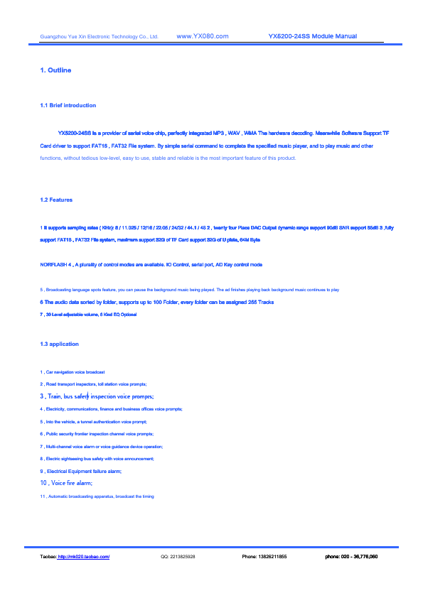 5 3. Serial communication protocol 6 3.1 Communication format 6 3.2 Communication instruction 7 3.3 Module returns data 9 3.3.1. Return power data module 9 3.3.2 Tracks play data returned completed 10 3.3.3 Module response data returned 10 3.3.4 Module error data returned 11 3.3.5 Message insertion and removal device 11 3.4 Detailed instructions Serial 12 3.4.1. Specify the song play command 12 3.4.2 Specifies the volume of playback instruction 12 3.4.3 Spe