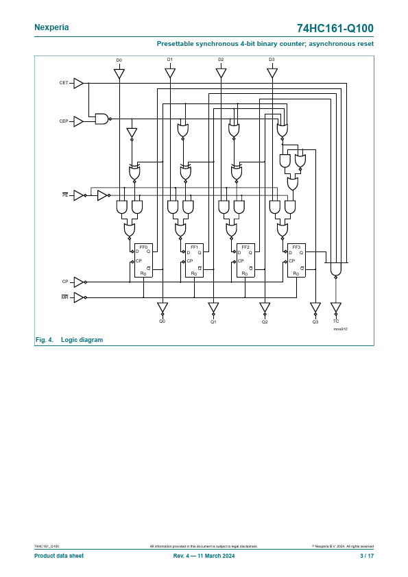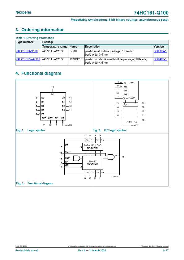 74HC161-Q100 Presettable synchronous 4-bit binary counter; asynchronous reset Rev.4 * 11 March 2024 Product data sheet 1.General descri.74HC161-Q100 Features