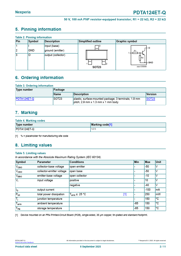 PDTA124ET-Q 50 V, 100 mA PNP resistor-equipped transistor; R1 = 22 kΩ, R2 = 22 kΩ 8 September 2025 Product data sheet 1.General .PDTA124ET-Q Features