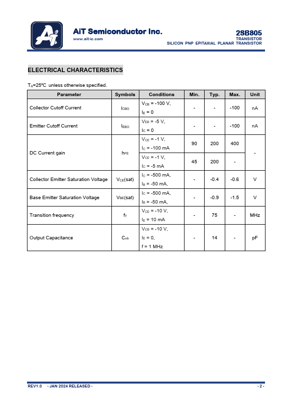 • High collector to emitter voltage: VCEO>-100V. • Excellent hFE linearity.