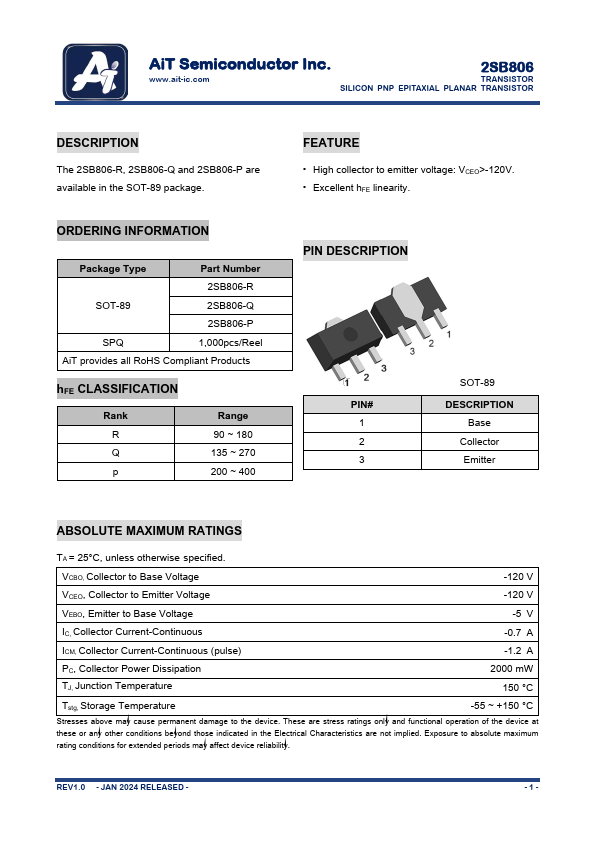 The 2SB806-R, 2SB806-Q and 2SB806-P are available in the SOT-89 package.