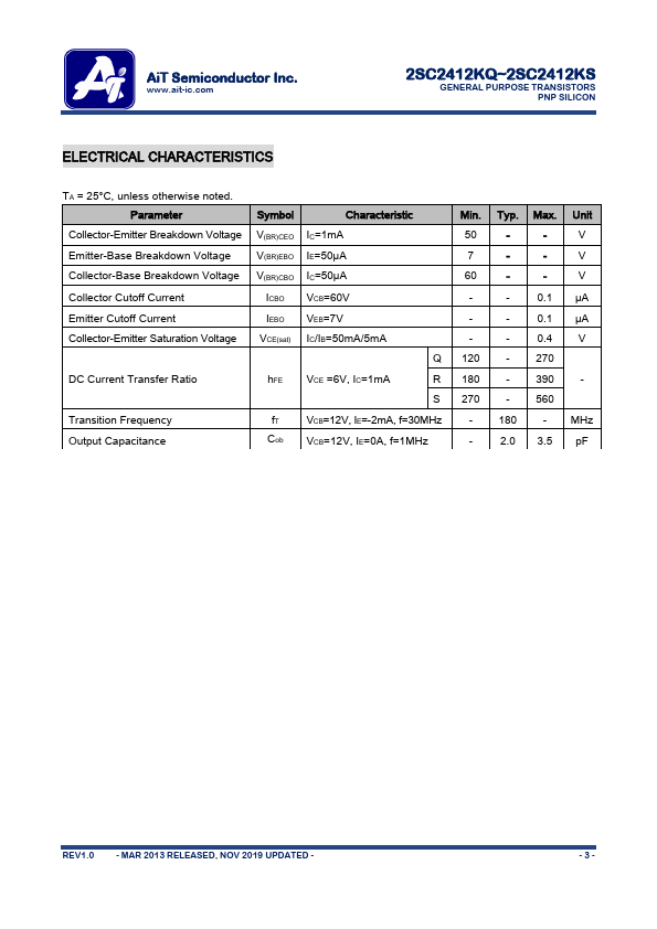www.ait-ic.com 2SC2412KQ~2SC2412KS GENERAL PURPOSE TRANSISTORS PNP.