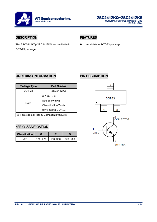 www.ait-ic.com 2SC2412KQ~2SC2412KS GENERAL PURPOSE TRANSISTORS PNP.
