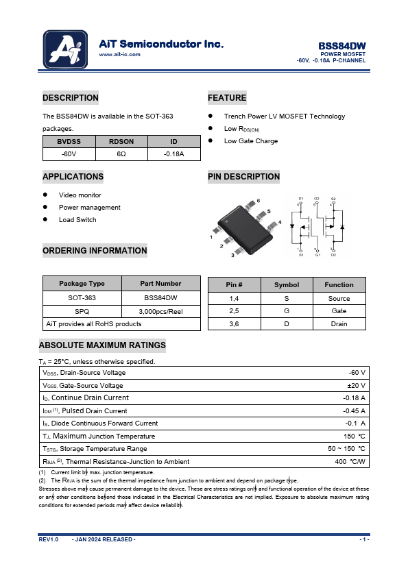 POWER MOSFET -60V, -0.18A P-CHANNEL