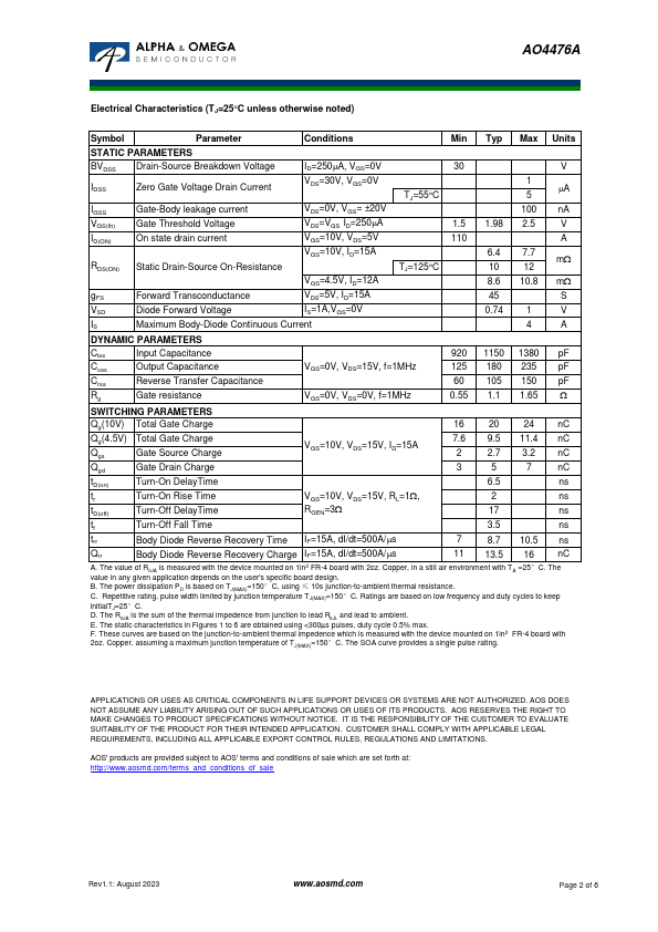 The AO4476A combines advanced trench MOSFET technology with a low resistance package to provide extremely low RDS(ON). This device is suitable for use as a high side switch in SMPS and general purpose applications.