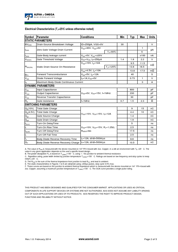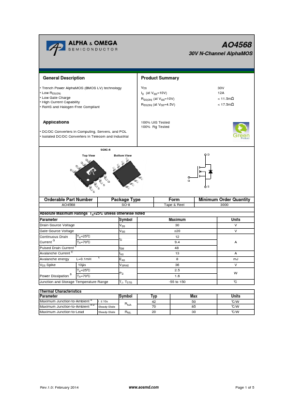 • Trench Power AlphaMOS (αMOS LV) technology • Low RDS(ON) • Low Gate Charge • High Current Capability • RoHS and Halogen-Free Compliant