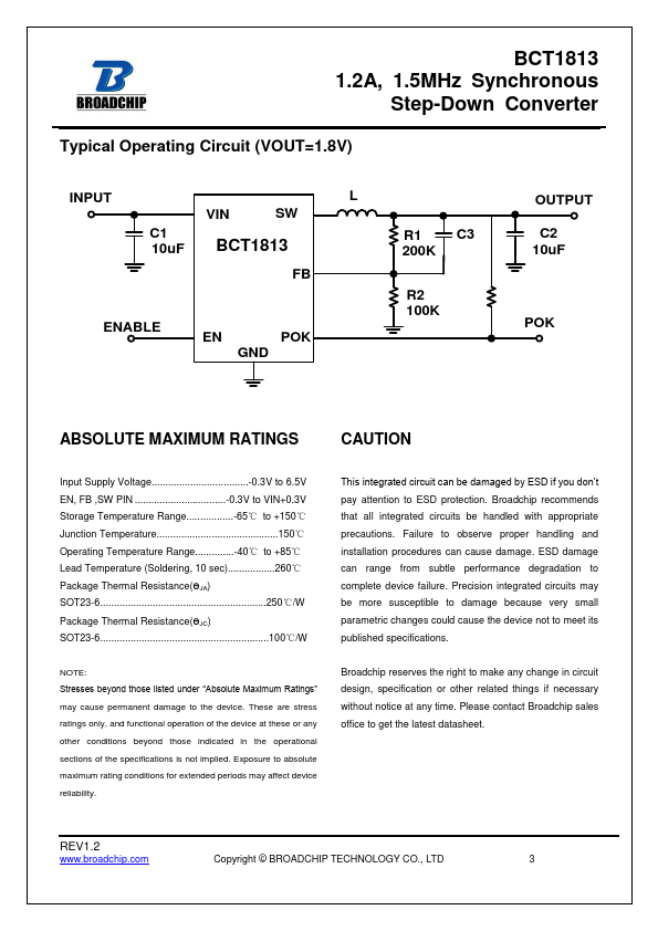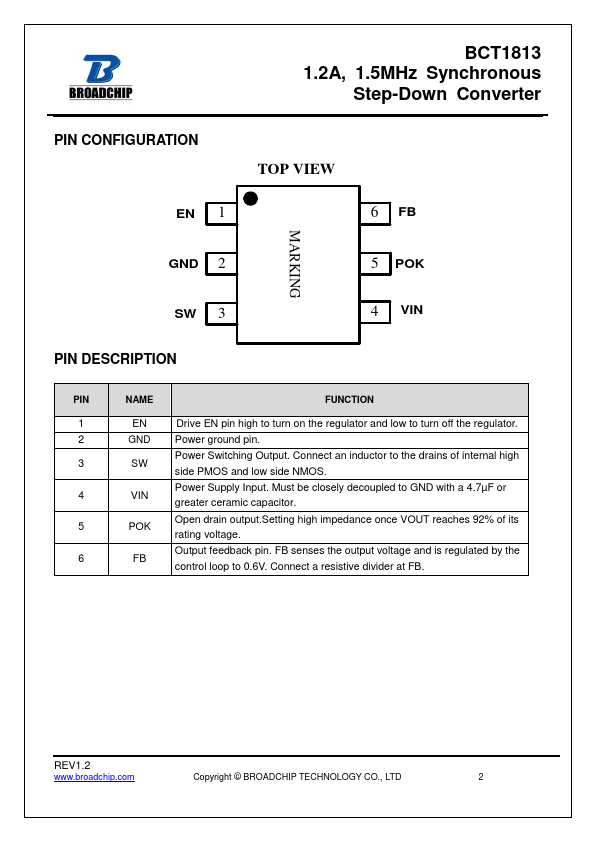 The BCT1813 is a high efficiency, high frequency synchronous DC-DC step-down converter.