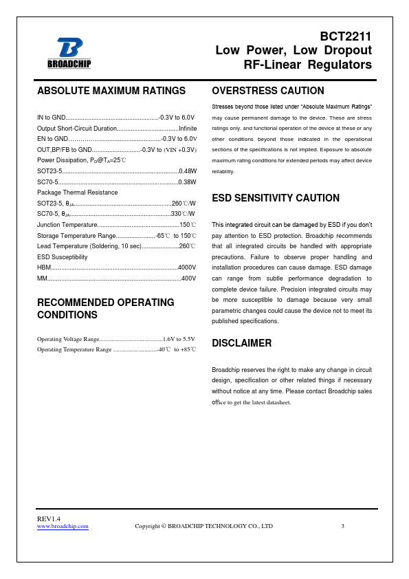 The BCT2211 series low-power, low-dropout, CMOS linear voltage regulators operate from a 1.6V to 5.5V input voltage and deliver up to 500mA output current.