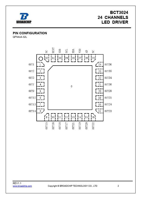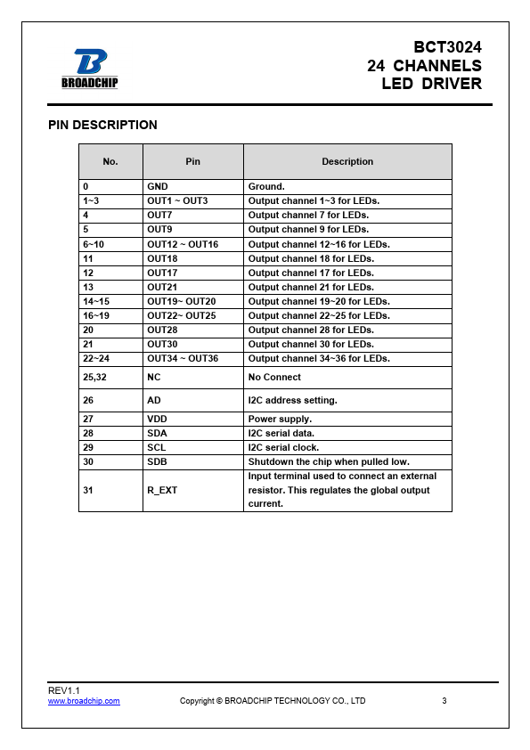 The BCT3024 is a LED driver with independent 24 output channels, and the output current of each channel can be programmed to achieve 256 levels by I2C interface.