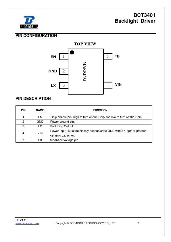 The BCT3401 is a high efficiency synchronous DC-DC step-down converter designed to drive LED, using a constant frequency and current.