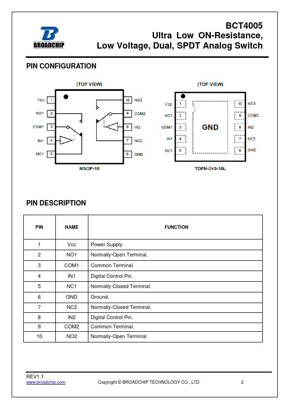 The BCT4005 is a high-performance, dual single-pole double-throw (SPDT) analog switch.
